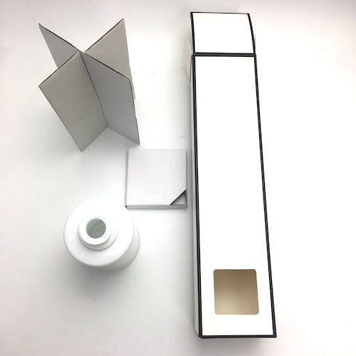 White with Black Trim Gift Box For Diffuser Bottle with inner support, packaged in groups of 12 with plastic wrap for protection